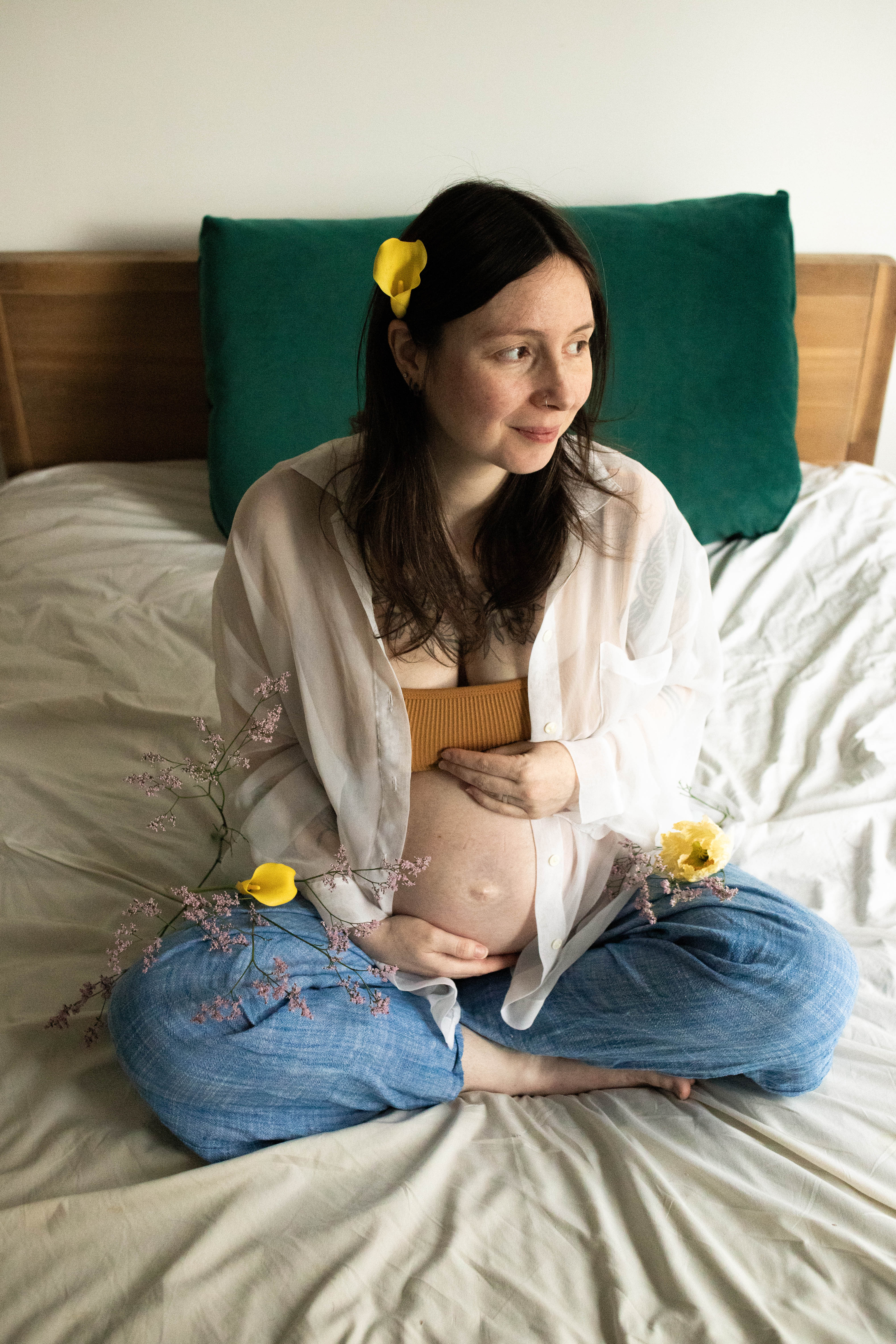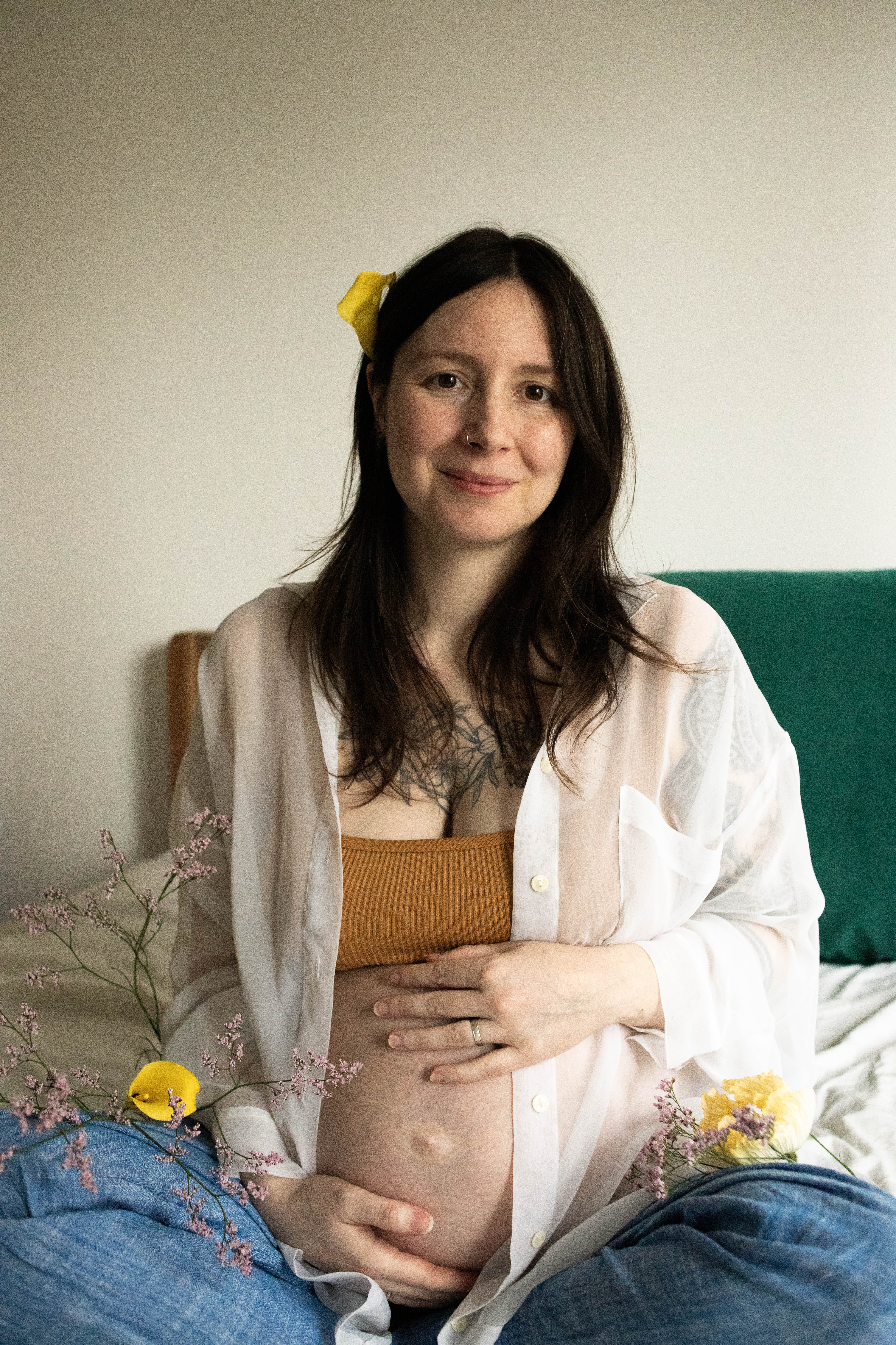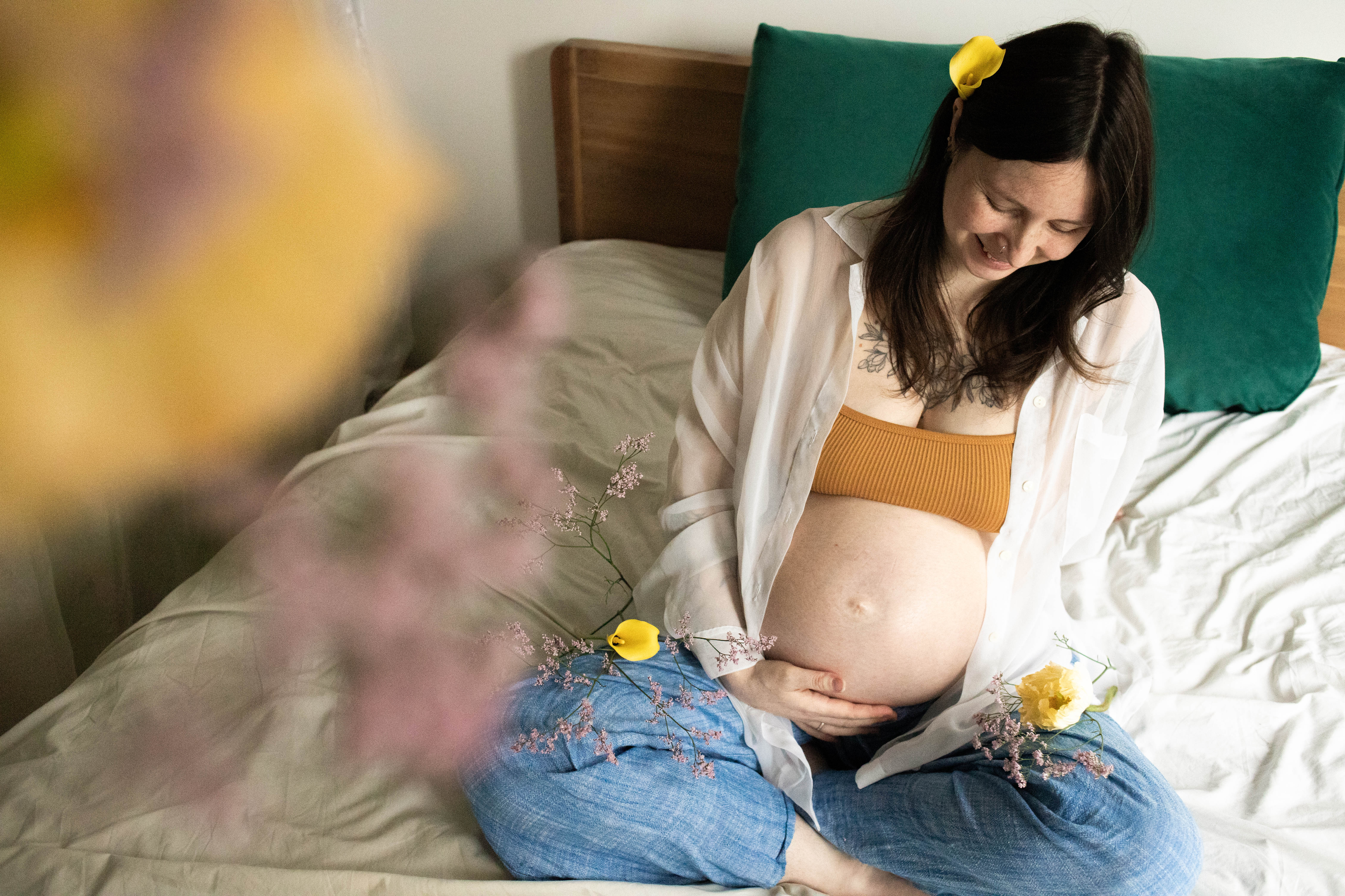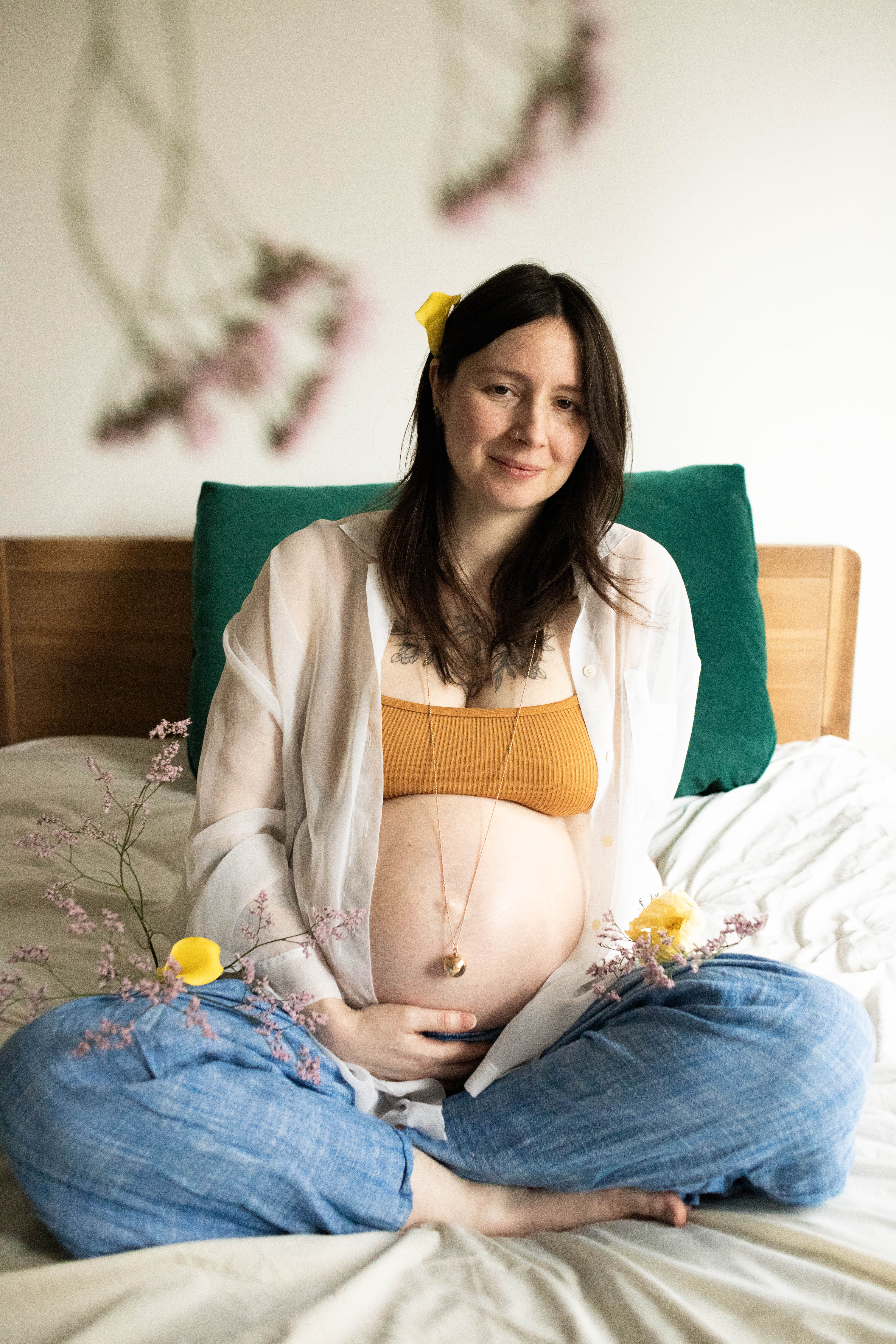 Le temps passait et j’avais envie de m’essayer à la photo de grossesse. Je voulais avoir des exemple à montrer avant de proposer cette prestation. J’ai naturellement repensé à Lindsay, qui a tout de suite accepté de se prêter au jeu. Je lui ai envoyé quelques inspirations qui correspondent à mon style : des couleurs neutres, une ambiance douce et cosy et des fleurs.
