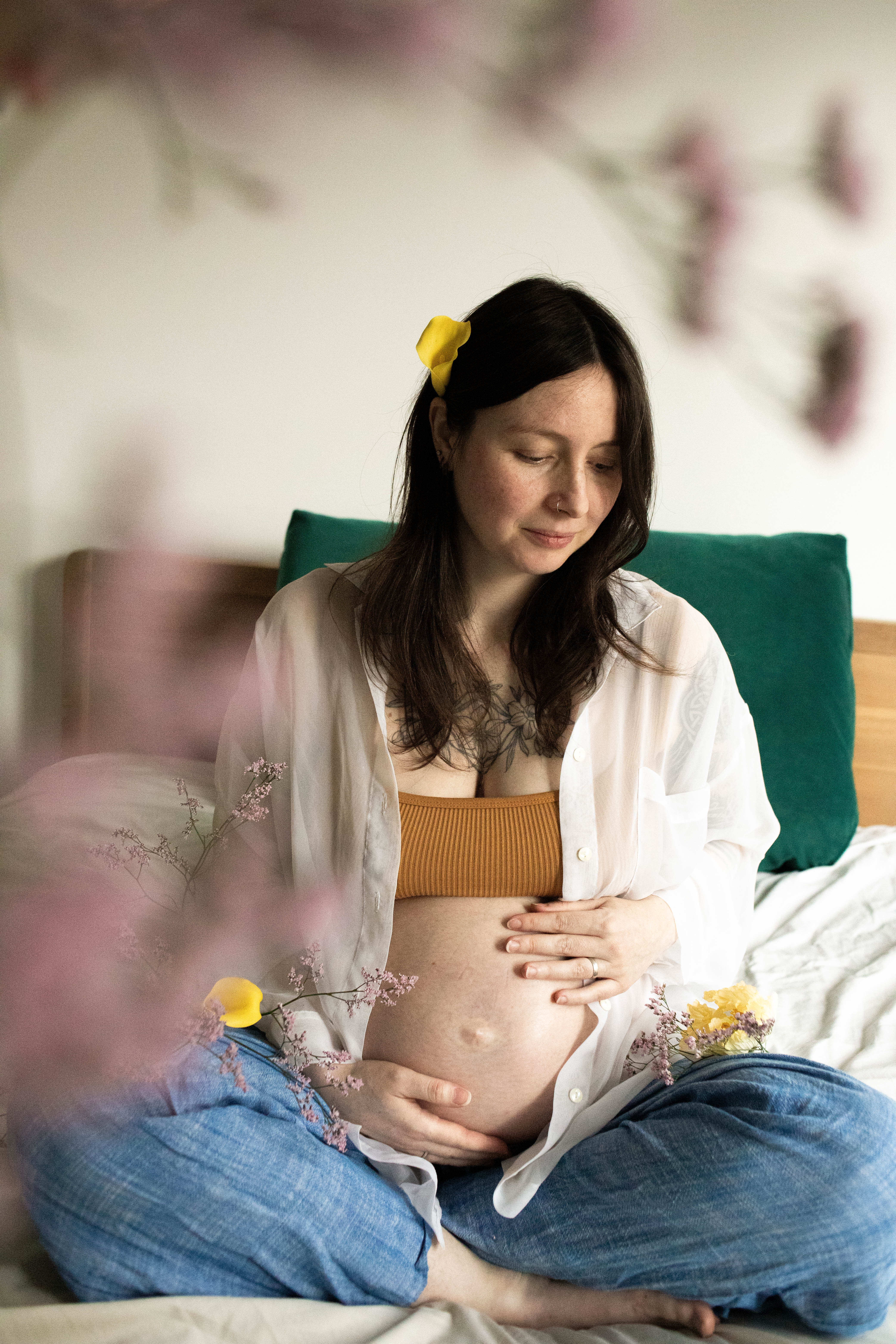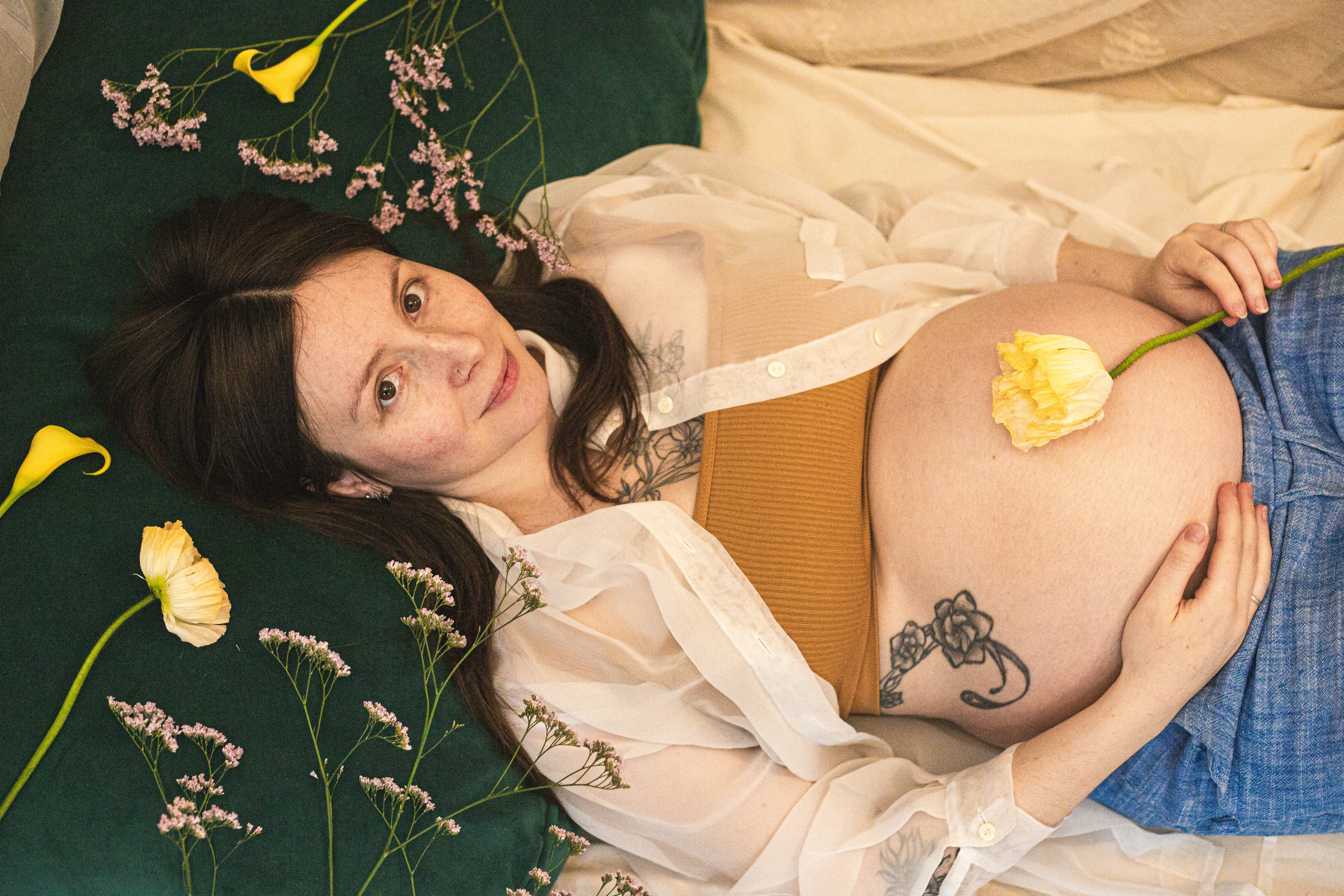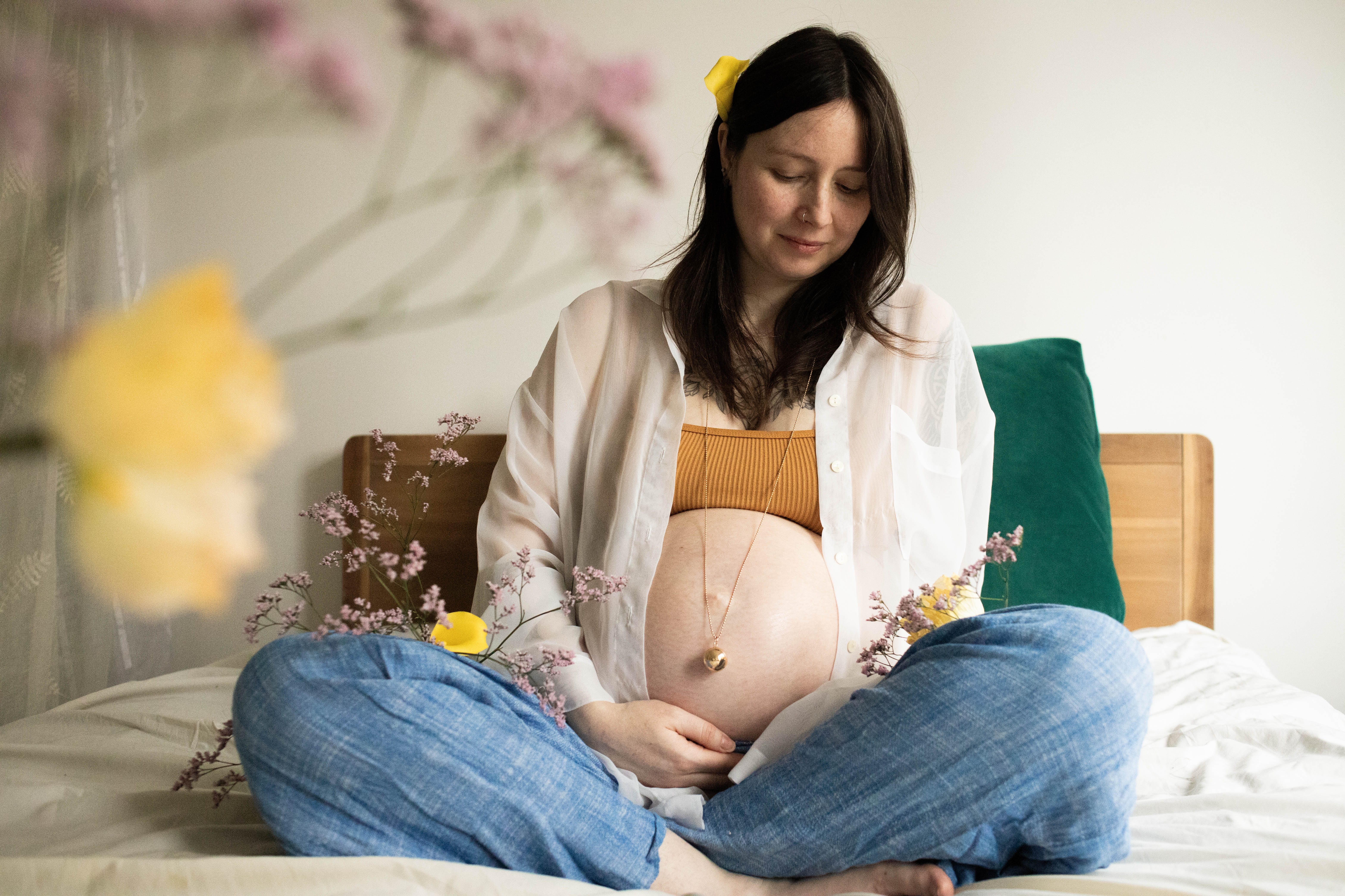 Le temps passait et j’avais envie de m’essayer à la photo de grossesse. Je voulais avoir des exemple à montrer avant de proposer cette prestation. J’ai naturellement repensé à Lindsay, qui a tout de suite accepté de se prêter au jeu. Je lui ai envoyé quelques inspirations qui correspondent à mon style : des couleurs neutres, une ambiance douce et cosy et des fleurs.
