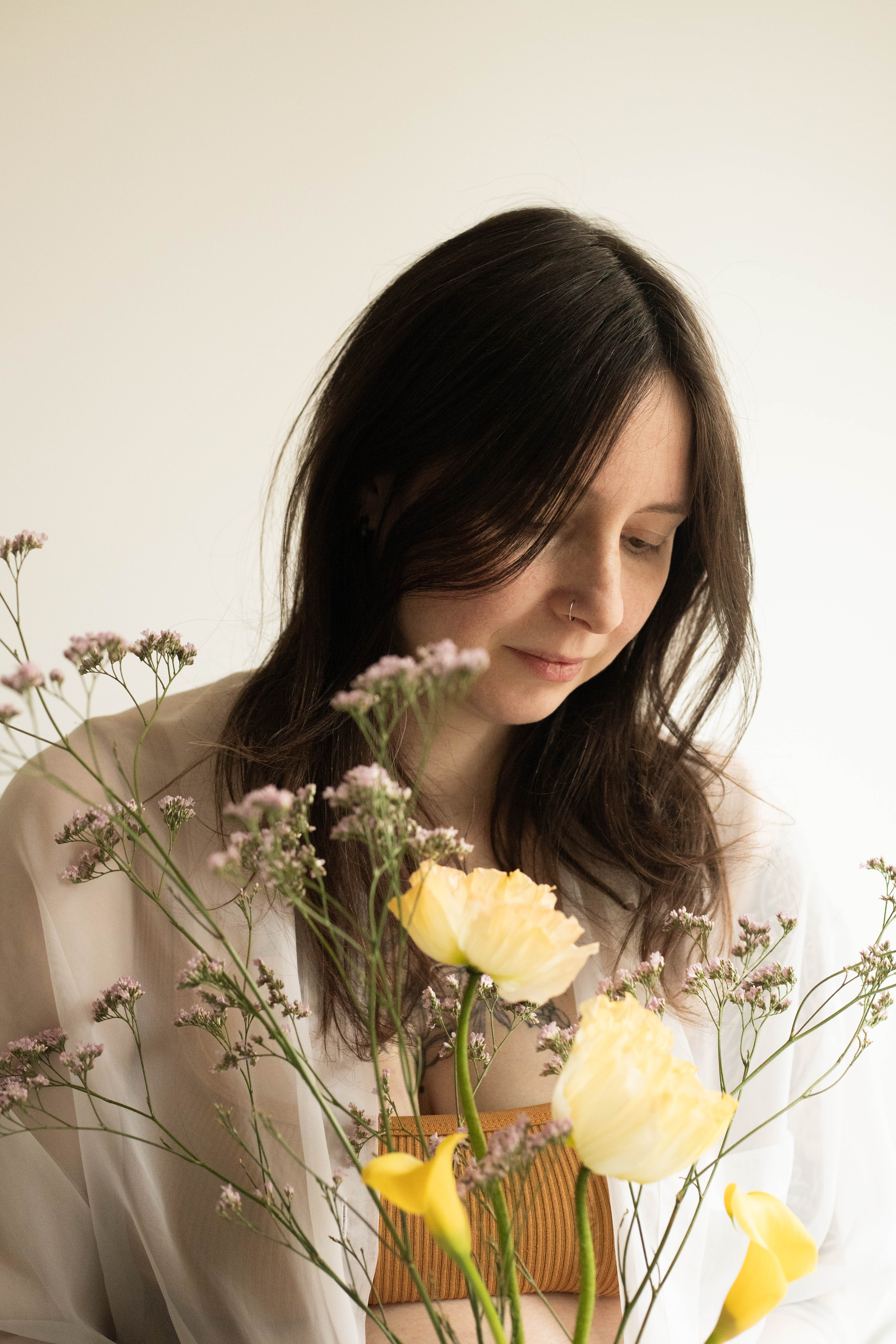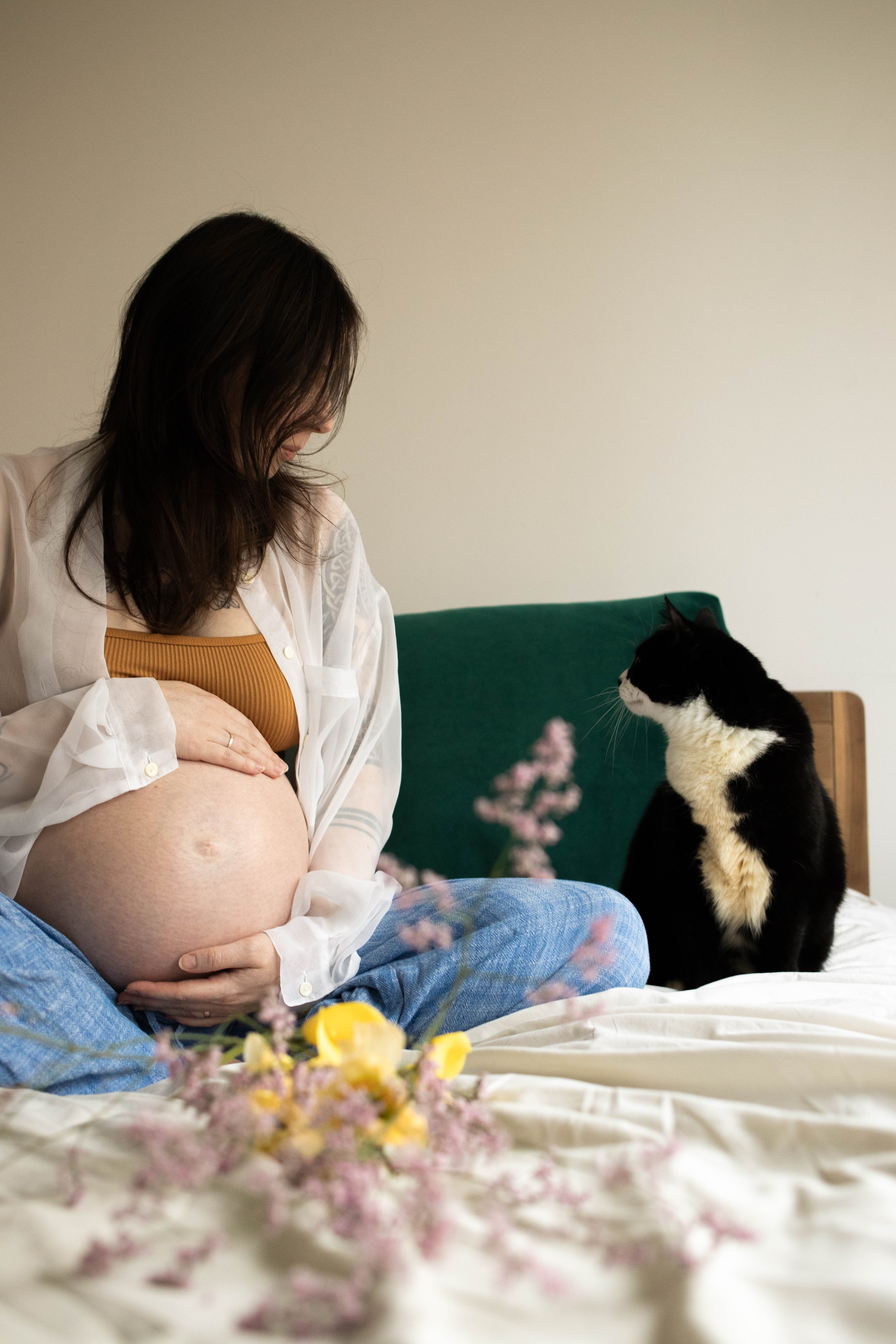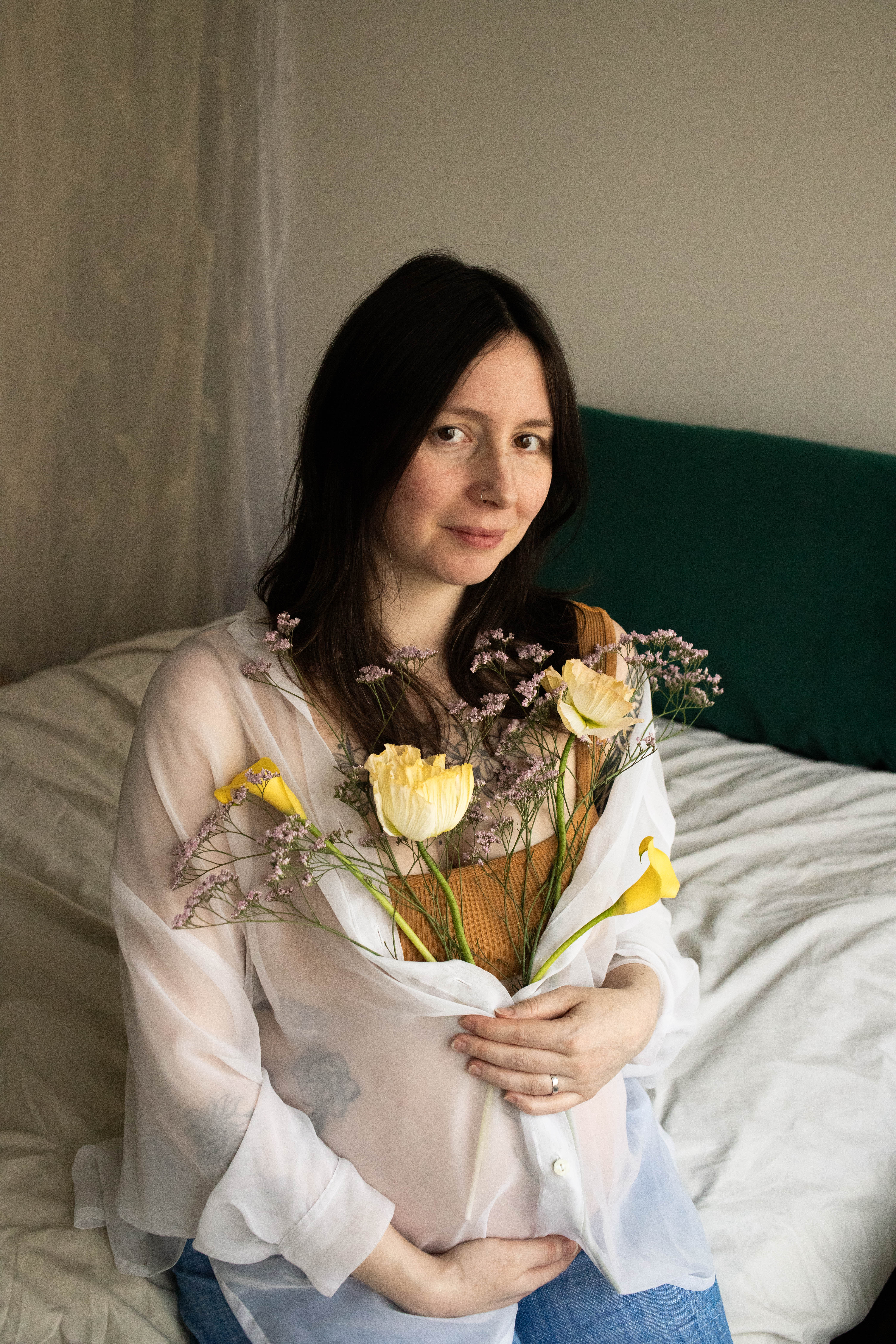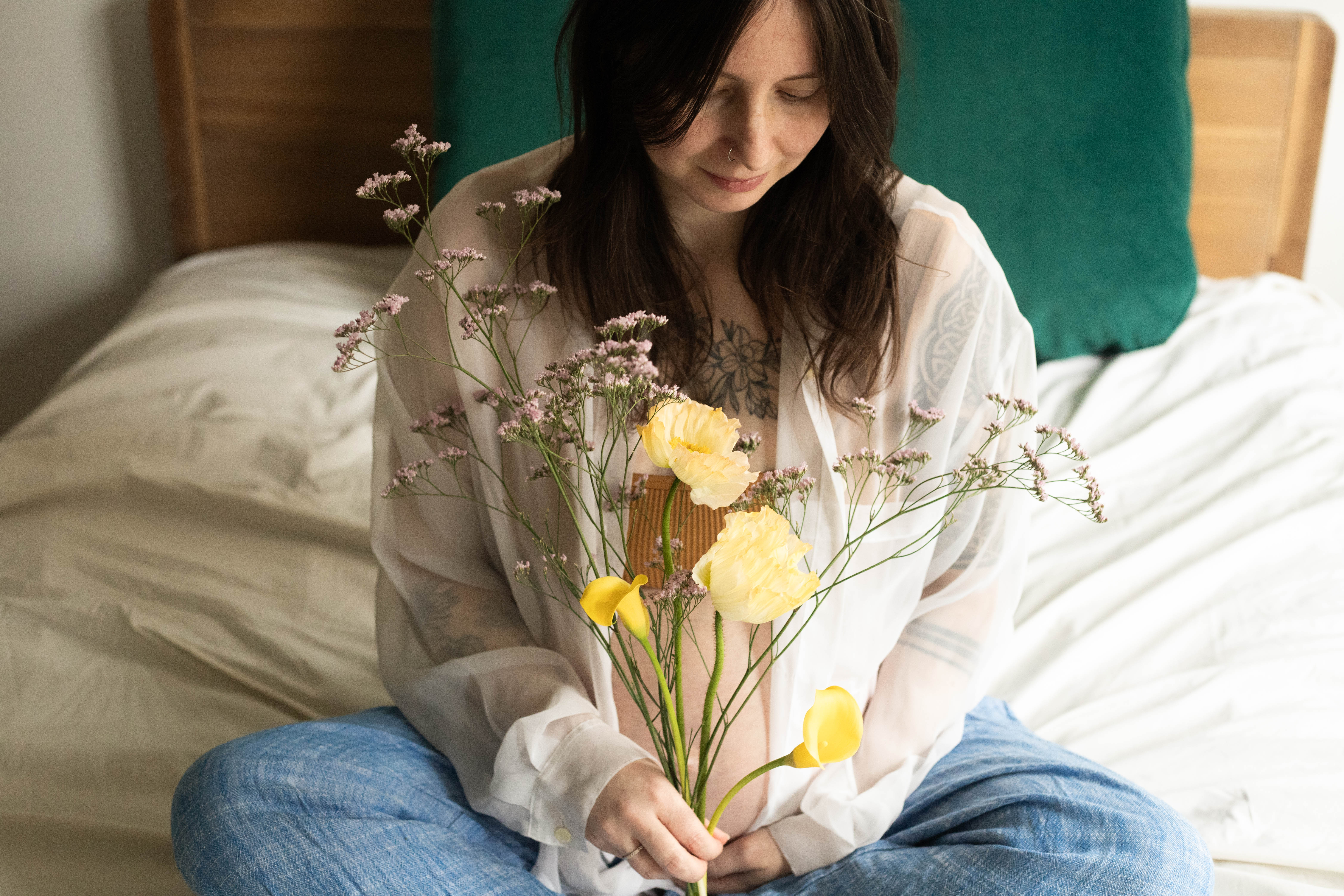 Le temps passait et j’avais envie de m’essayer à la photo de grossesse. Je voulais avoir des exemple à montrer avant de proposer cette prestation. J’ai naturellement repensé à Lindsay, qui a tout de suite accepté de se prêter au jeu. Je lui ai envoyé quelques inspirations qui correspondent à mon style : des couleurs neutres, une ambiance douce et cosy et des fleurs.